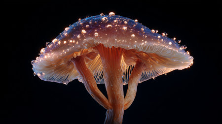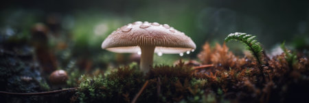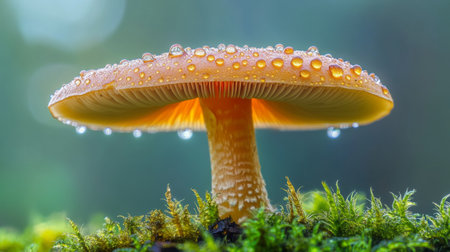 A detailed macro shot of a single mushroom with dew droplets on its cap, showcasing the delicate textures and beauty of fungi in the early morning light.