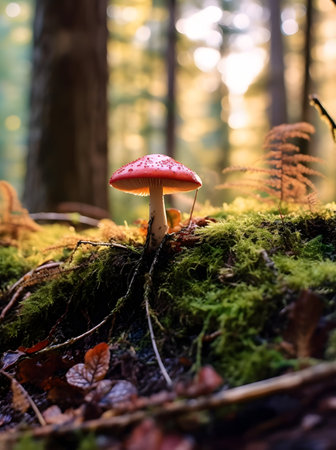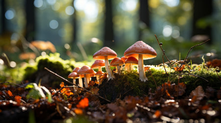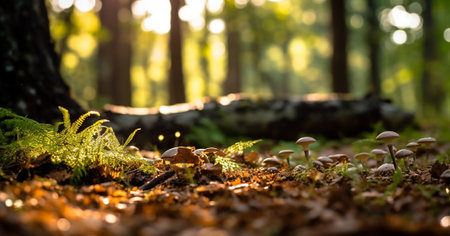 Enchanting forest mushrooms illuminated by soft afternoon light. Nature aesthetics, fungi close-up, woodland scene, environmental beauty concept.