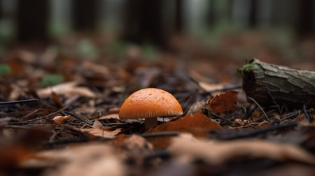 A stunning close-up of a vibrant amber mushroom rising from the forest floor amidst fallen autumn leaves. This image captures the beauty and serenity of nature.