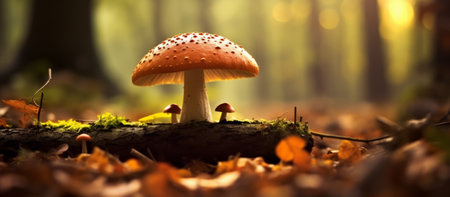 A close-up of mushrooms growing on the forest floor, surrounded by fallen autumn leaves, in warm, golden sunlight, evoking the natural beauty of forest ecosystems.