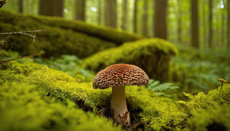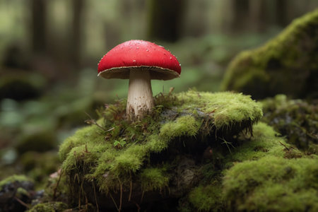 A mushroom sitting on top of a moss covered forest. AI generative image.