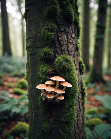 AI Generated. Mushrooms Growing on Mossy Tree Trunk in Forest