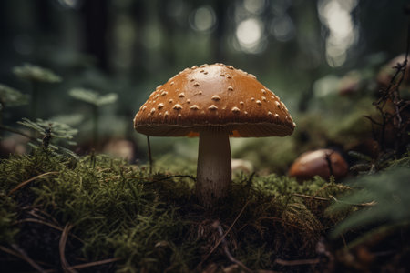 A close up of a mushroom on a moss covered ground. Generative AI image.
