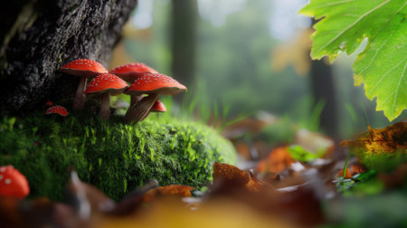 Bright fungi growing wild in a dense forest, framed by rich moss and fallen autumn leaves