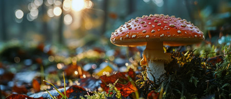 A magical close-up of an amanita mushroom adorned with dew drops, glowing in warm light with a blurred forest bokeh background.