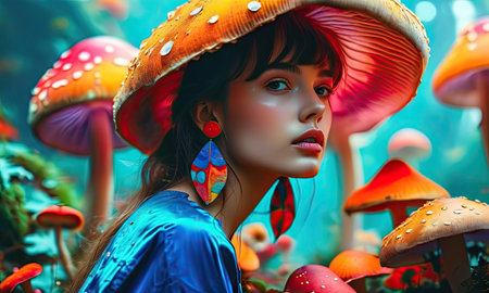 A woman standing in front of a vibrant mushroom forest