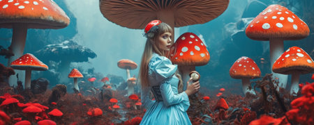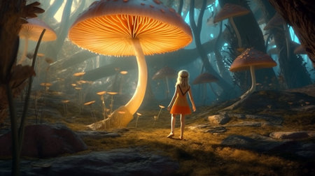 Discover a dreamlike forest scene, where a mystical girl wanders among giant, vibrant toadstools, with sunlight filtering through the trees
