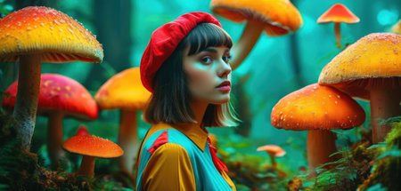 Portrait of a beautiful girl in a red hat among the mushrooms.