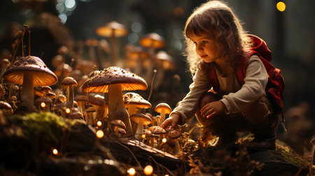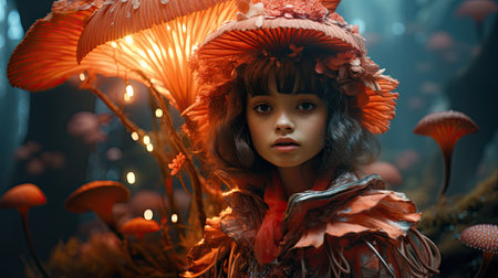A young girl in red coat standing among a group of mushrooms, AI