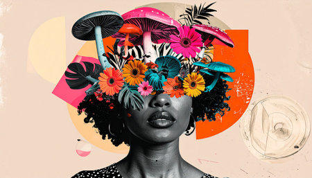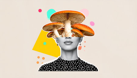 Artistic halftone human head collage with mushrooms. Art classes poster, creative ideas concept. Trendy graphic on simple background.