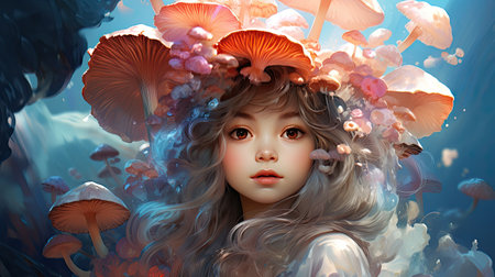 Beautiful mermaid with fantasy mushrooms. Fantasy illustration.