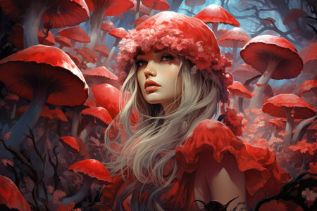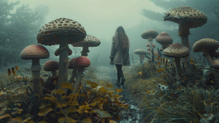 A woman walks through a forest of mushrooms. The mushrooms are large and red, and the forest is dark and mysterious. The woman is alone, and the scene gives off a sense of solitude and wonder