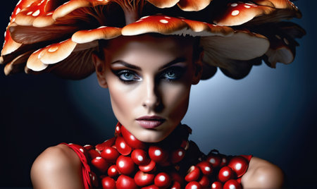 a beautiful girl in a hat with mushrooms.