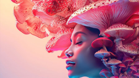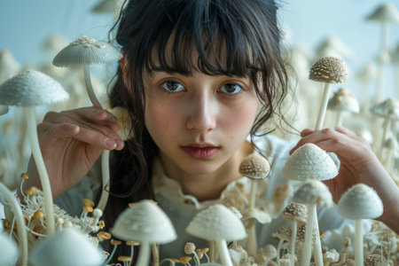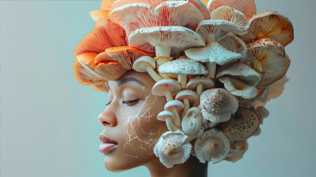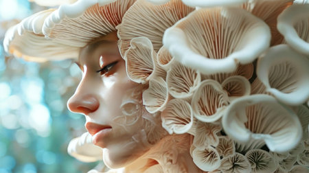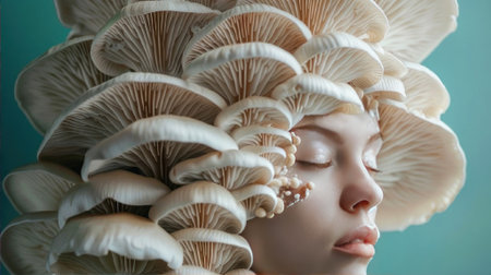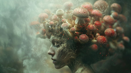 Surreal fusion of human and fungi, a tranquil face amidst a cluster of mushrooms. A mesmerizing download for the imaginative. Generated A.I.