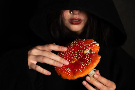 A hooded woman dressed in black holds large red fly agaric mushrooms with white spots, highlighting their toxic and dangerous appearance in a dark mysterious setting.