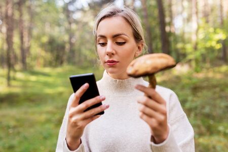 Woman using smartphone to identify mushroom