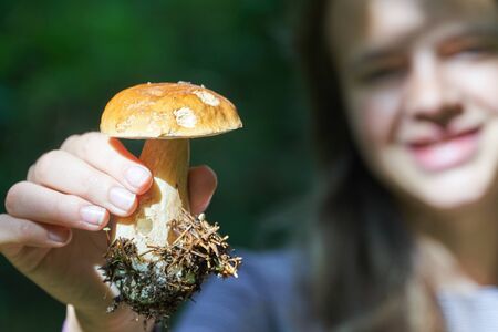 Teenage girl shows a mushroom boletus edulis in hand in the forest