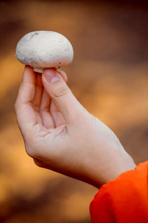 Close up view of hand holding freshly picked mushroom. On blurred autumn forest, mushrooming