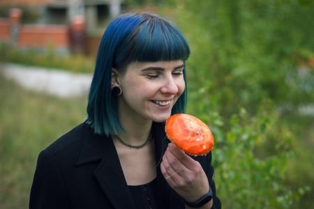 blue hair girl eating toadstool