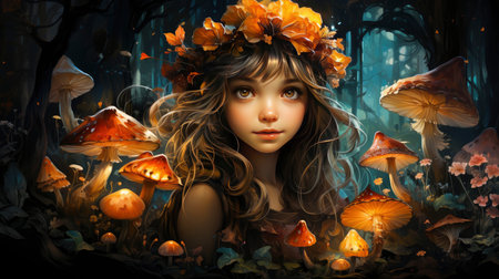 Beautiful young woman in a hat with mushrooms. Fantasy illustration.
