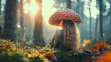 A whimsical scene of a woman sitting beside a large mushroom in a sunlit forest, evoking a sense of magic and wonder.