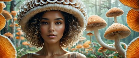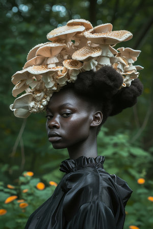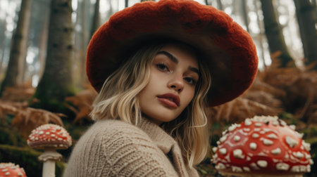 Elegant woman with a unique mushroom hat in a mystical forest setting