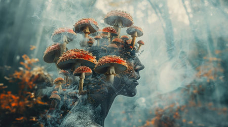 Conceptual Image of Person with Semi-Transparent Head Revealing Amanita Mushrooms.