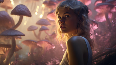Enchanting Young Woman amidst a Mystic Mushroom Wonderland, Dreamy Fantasy Portrait in Ethereal Light AI Generative