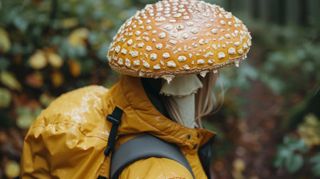 Young Woman in a Yellow Raincoat Explores the Forest with a Large Mushroom on Her Head