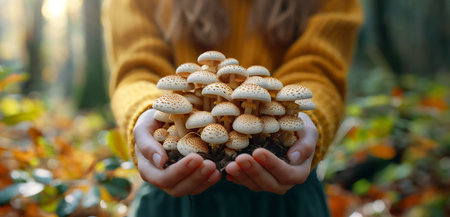 Girl's hands delicately holding freshly picked mushrooms in a forest setting with background of blurred foliage and soft dappled sunlight. Seasonal healthy food concept. Generative AI.