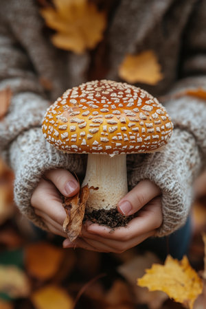 In a tranquil forest during autumn, a person holds a striking, orange mushroom topped with distinct spots. The surrounding trees display vibrant foliage.