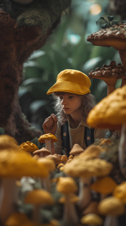 Little girl in a yellow hat among mushrooms. Selective focus.