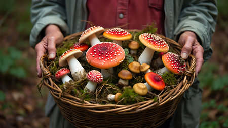 A person in a green jacket carefully carries a wicker basket filled with a colorful assortment of mushrooms gathered from the forest floor The mushrooms a mix of Fly Agaric with their distinctive red caps and white spots alongside smaller brown varieties rest upon a bed of green moss The scene captures the essence of foraging and the bounty of the forest highlighting natures gifts and the quiet pleasure of mushroom hunting The focus is sharp bringing out the textures of the mushrooms and the basket
