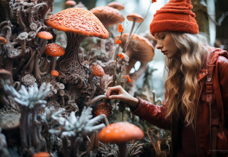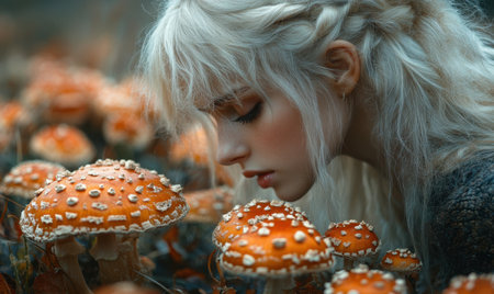 A young woman with long, light hair studies brightly colored mushrooms in a serene forest. The enchanting atmosphere creates a magical moment in nature.