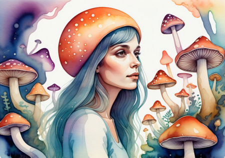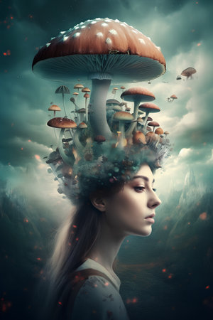 Conceptual Image of Blonde Girl with Semi-Transparent Head Revealing Amanita Mushrooms.