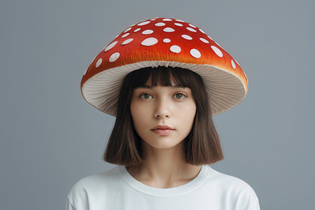 Playful portrait of a woman in Alice in Wonderland style with a whimsical mushroom hat and quirky expression