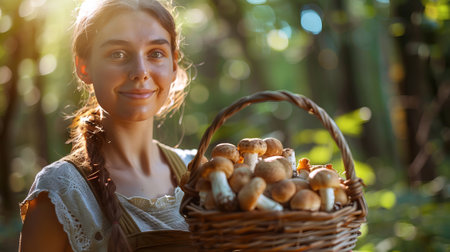Caucasian woman holding a basket of mushrooms in a forest. Concept of mushroom foraging, nature, outdoor activity, smiling.