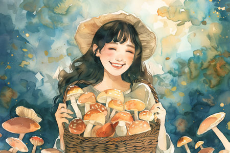 Soft watercolor illustration of smiling Asian woman holding a basket of mushrooms. Concept of woman, basket, mushrooms, illustration.