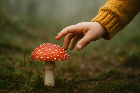 Child's hand reaching towards red toadstool mushroom in forest environment, curiosity and exploration in autumn woodland scene.
