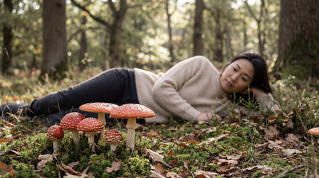 Curious woman relaxing in autumn forest observing red mushrooms on mossy ground amid fallen leaves and soft natural sunlight.