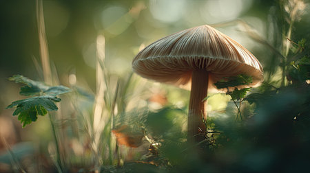 Enchanting forest mushrooms illuminated by soft afternoon light. Nature aesthetics, fungi close-up, woodland scene, environmental beauty concept.