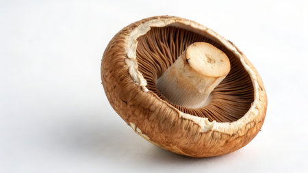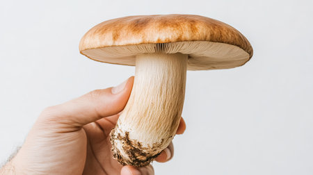A fresh organic mushroom is held delicately by a hand against a minimalistic white background. This image captures the essence of healthy eating and culinary art.