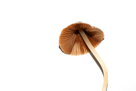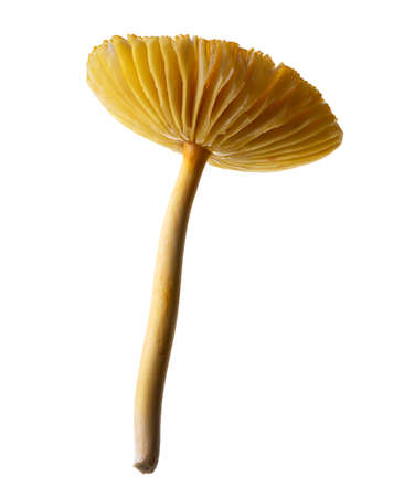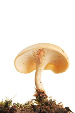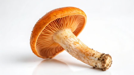 A clean shot of a single mushroom with a focus on its stem and cap, placed centrally on a white background to emphasize its shape and texture.