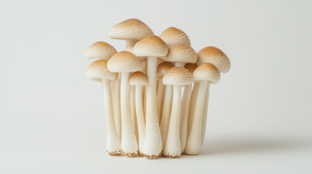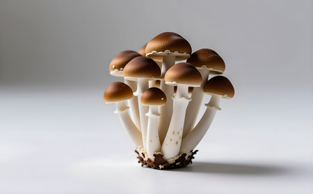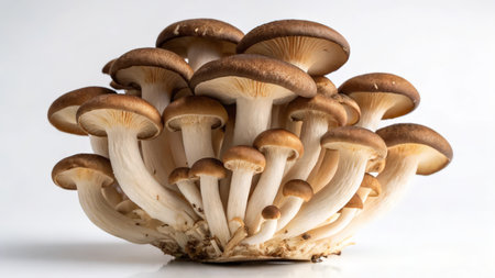 Cluster of brown beech mushrooms (Shimeji) isolated on a white background, highlighting their delicate texture and natural colors