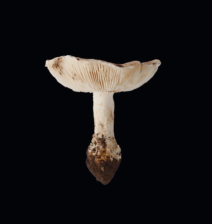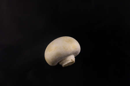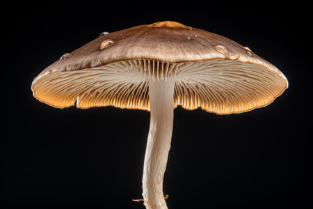 Striking close-up single mushroom dark mysterious black background, intricate textures details