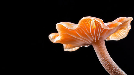 Close-up of an orange mushroom, showcasing its gills, set against a stark black backdrop, highlighting its texture and form.