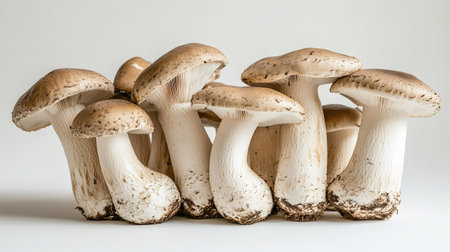 Matsutake mushrooms displayed in a natural arrangement, showcasing their unique features on a white background.