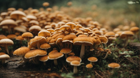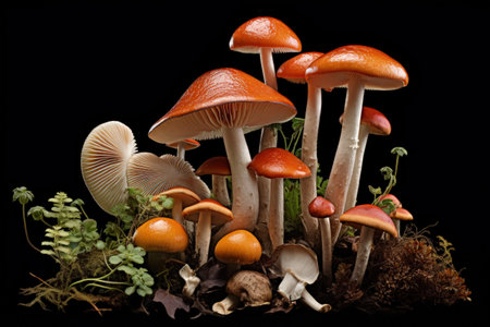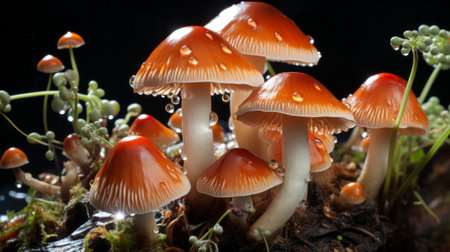 A vibrant group of wild mushrooms thriving together, captured in their natural, moist habitat.