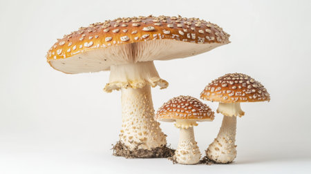 Three mushrooms with unique shapes and textures are displayed together, highlighting their distinct colors and patterns against a simple backdrop. Their natural features captivate the viewer.