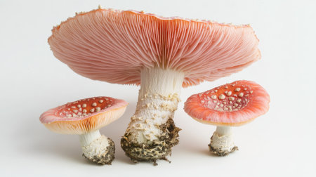Three pink mushrooms showcase their stunning colors and unique shapes in a calm setting, revealing their natural beauty and intricate gills.
